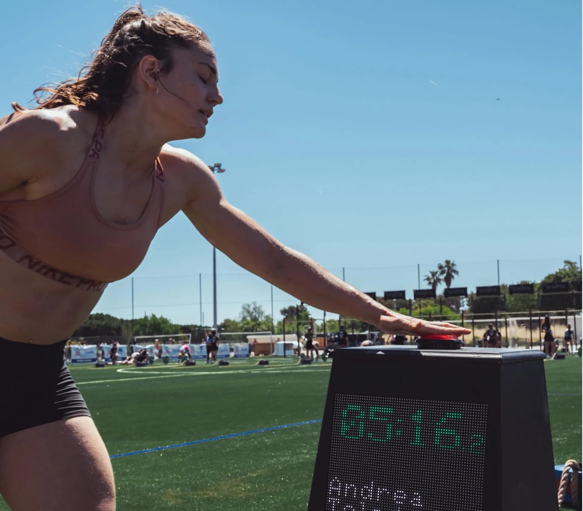 Buzzer + LED screen per lane: athlete sees THEIR name, THEIR timer, THEIR WOD. They own their lane. When they hit the buzzer, it's a finish moment — guaranteed emotion.